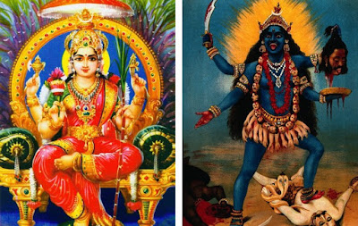 Our perception is that divinity is always associated with beauty, fragrance and love. Therefore, gods and goddesses are expected to please the eye. But vipareet process of love defies all these expectations. What we expect goddess to be is domesticated Gauri, but we forgot the vipareet of Gauri, i.e. Kali. Kali is everything what Gauri is not. Gauri is domesticated; Kali is wild. Gauri is nourishing; Kali is bloodthirsty. Gauri is of fair complexion; Kali is of dark complexion. Gauri is associated with Shankara; Kali is associated with Shiva. Gauri is worshiped during day; Kali is worshiped during mid night. Gauri seems to be caring; Kali seems to be fearsome. Gauri wears cloths like a married woman; Kali is naked. Gauri wears jewels and ornaments; kali wears galrand of human skulls. Gauri is worshiped in Shukla paksha; Kali is worshiped in Krishna Paksha. Gauri accepts patriarchal society; Kali rejects it. Gauri demands symbolic sacrifices; Kali demands physical sacrifices. Gauri is worshipped inside the house; Kali is worshipped outside the house. Gauri is associated with life; Kali associated with death. Gauri is the field; kali is the forest. So, both the aspects of Shakti need to be accepted. Kali is the vipareet of Gauri or Gauri is the vipareet of Kali; We can't decide. It does not have any beginning or end. This vipareetness is cyclic. And this cyclic theme is the core of Hinduism. What is born, has to die and then will be reborn and the process keeps going.